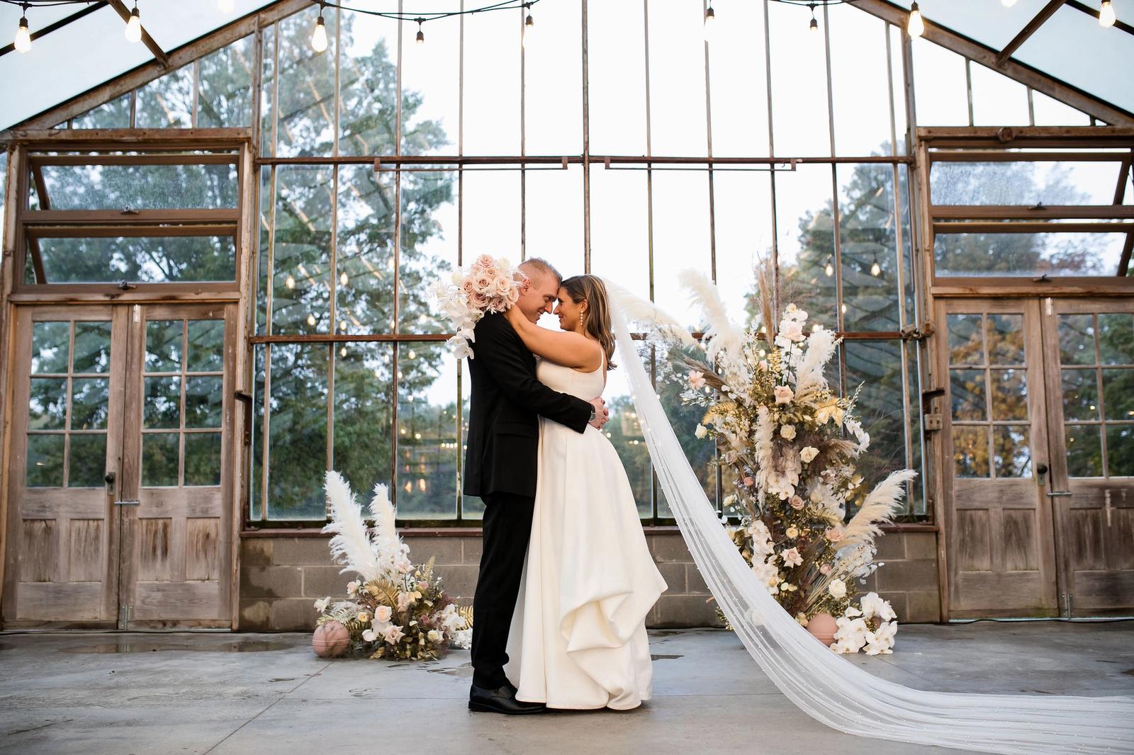When bohemian meets glamorous, orchids are juxtaposed with pampas grass, and metallic finishes are paired with matte neutrals, the result is simply fabulous! Thank you to our bride, Faith for choosing us to create such beauty for your day!!! I have so many good memories working with Faith. As we began conversations about creating a natural ceremony design which incorporated pampas grasses and metallic foliages inside Oak Grove's greenhouse to the unique dyed ombre baby's breath piece that swished along the back wall behind the bar adding pizzazz to the cocktail space, it was such a fun and creative process from start to finish! Our bride really wanted orchids to be a major focal point in both her bouquet and the reception space. We created dramatic, tall floral centerpieces that showed off the orchids and pampas grass while using delicate, small arrangements on the other tables to keep the room light and open. Photography was by Cusano Photography. Pre-wedding photos were taken at the historic Hotel LeVeque.