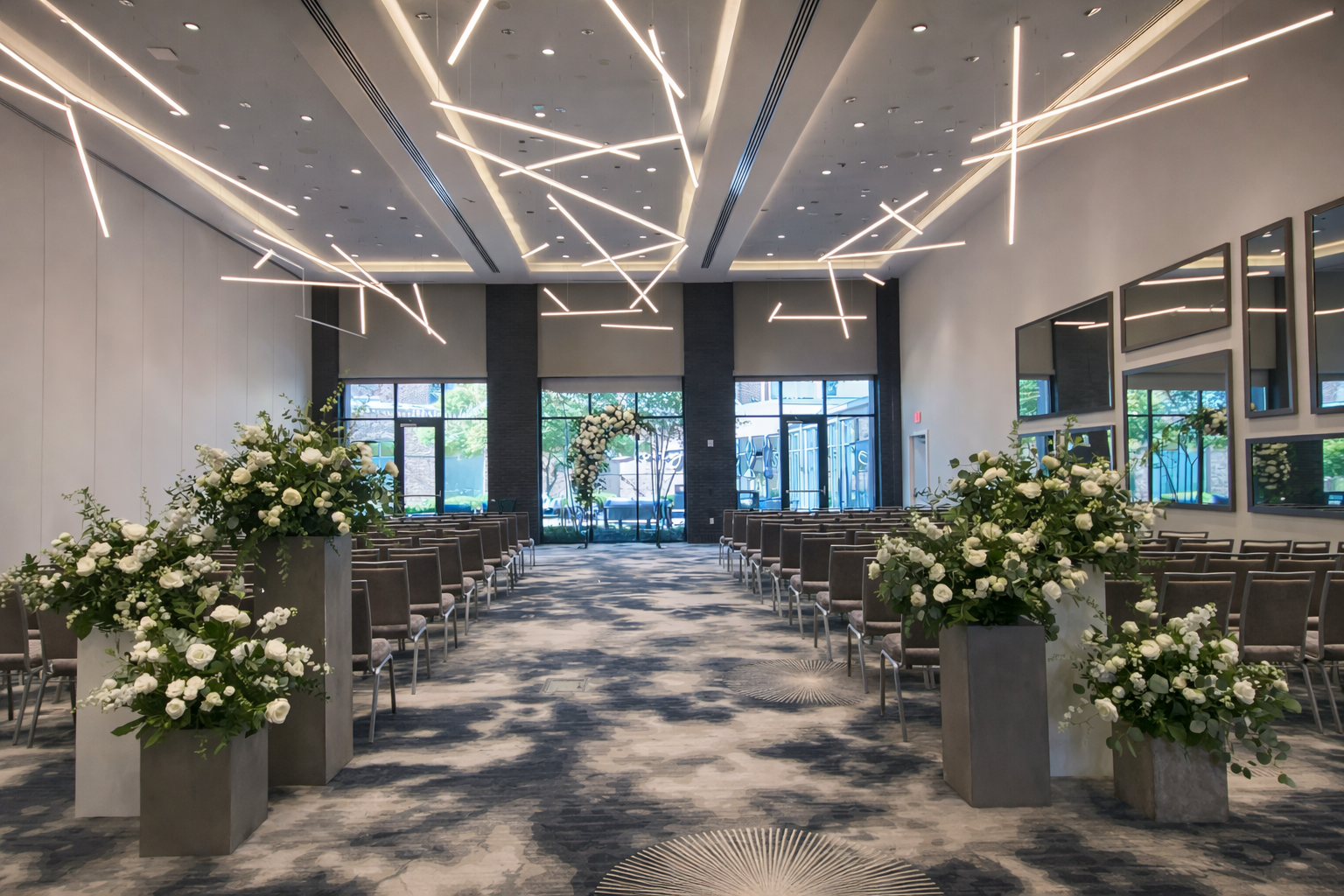 The Grand Event Center offers a clean, contemporary architectural framework defined by strong lines, neutral finishes, and an open layout. The space provides a refined visual foundation that allows décor, florals, and lighting to read clearly and cohesively, resulting in a finished look that feels intentional rather than overworked.